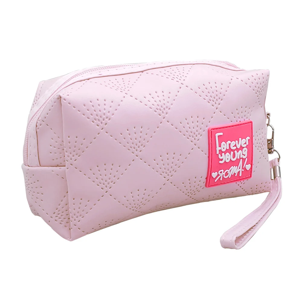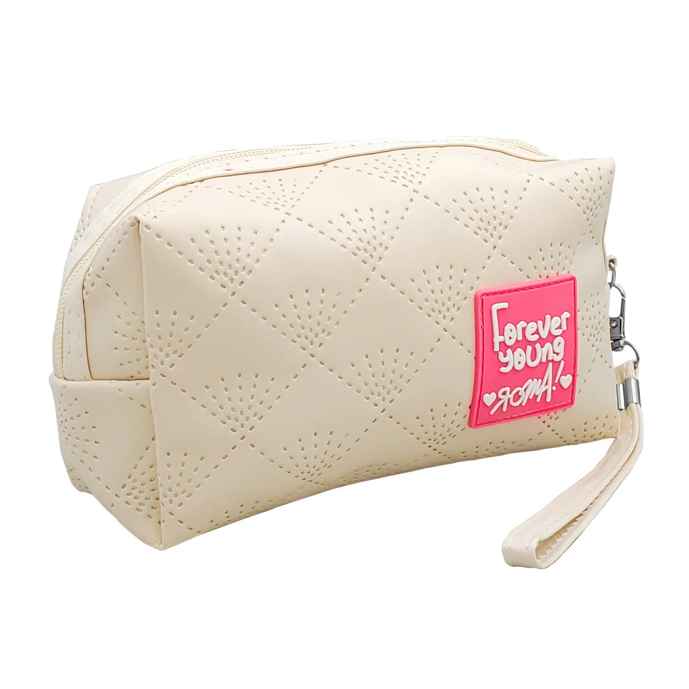 Esta Bolsa Cosmetiquera “Forever Young” destaca por su diseño sofisticado con texturas en relieve y acabados metálicos, ofreciendo una solución elegante y funcional para el transporte de tus artículos personales de belleza.