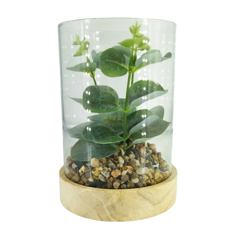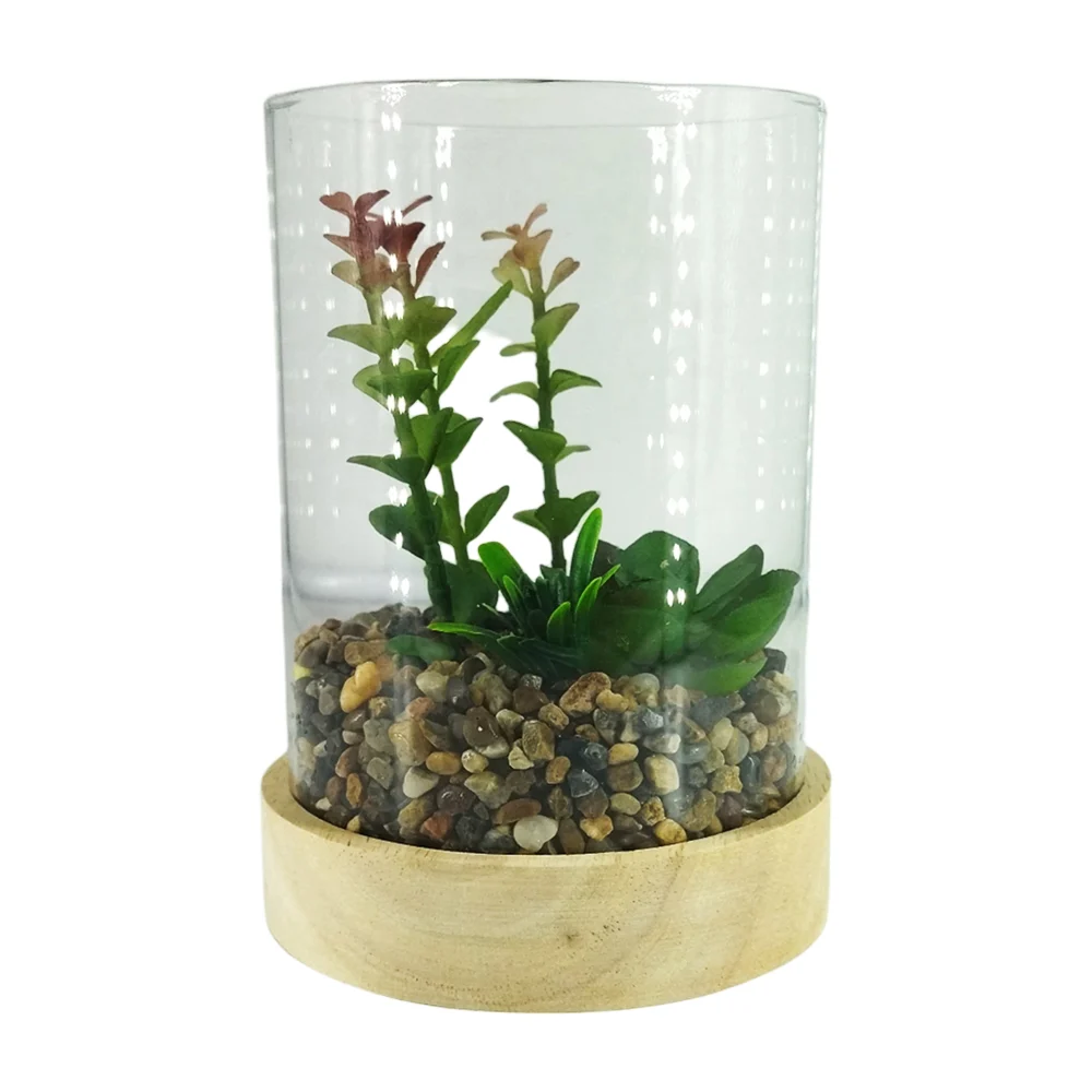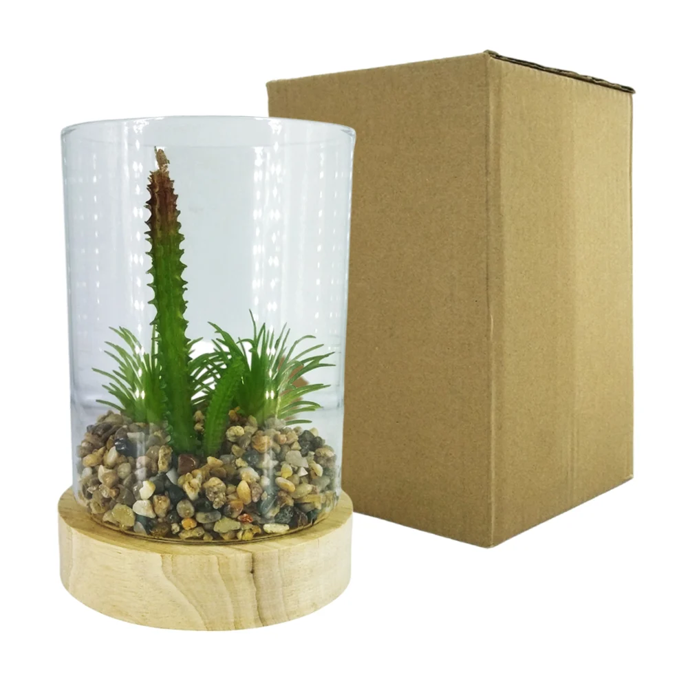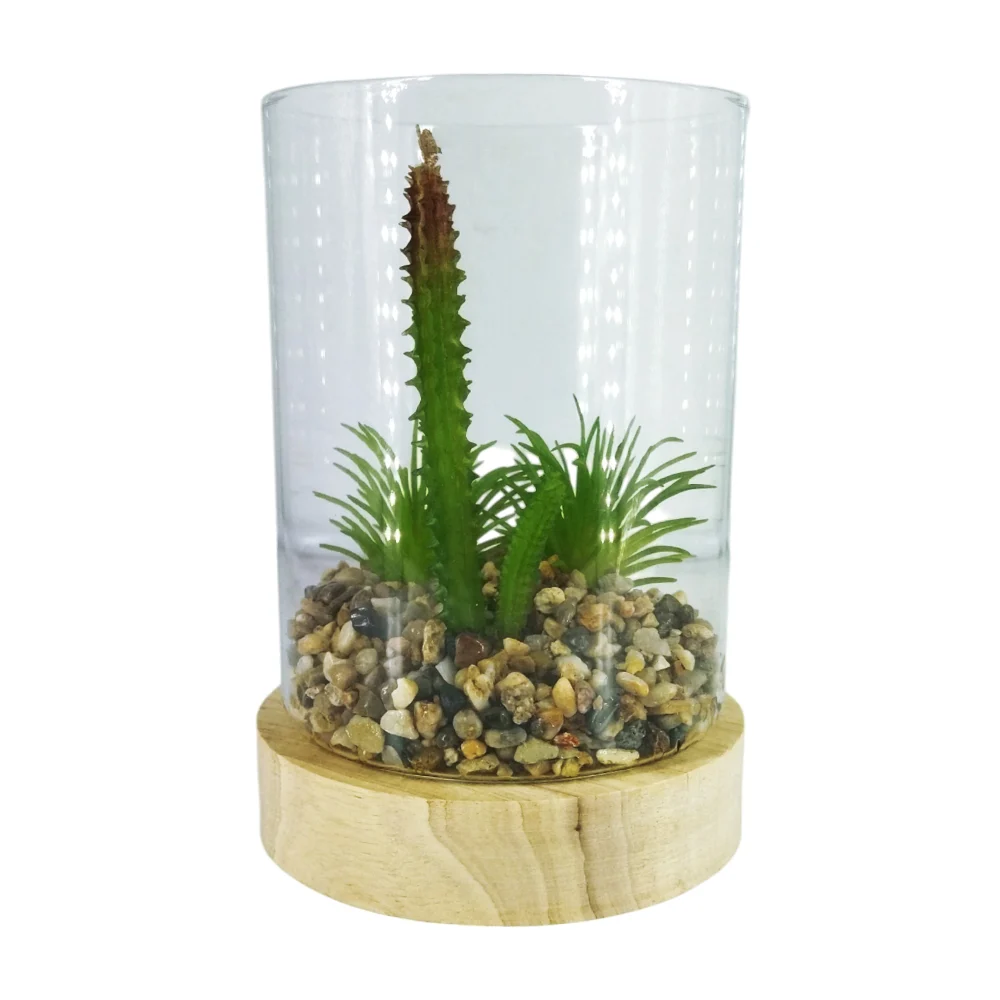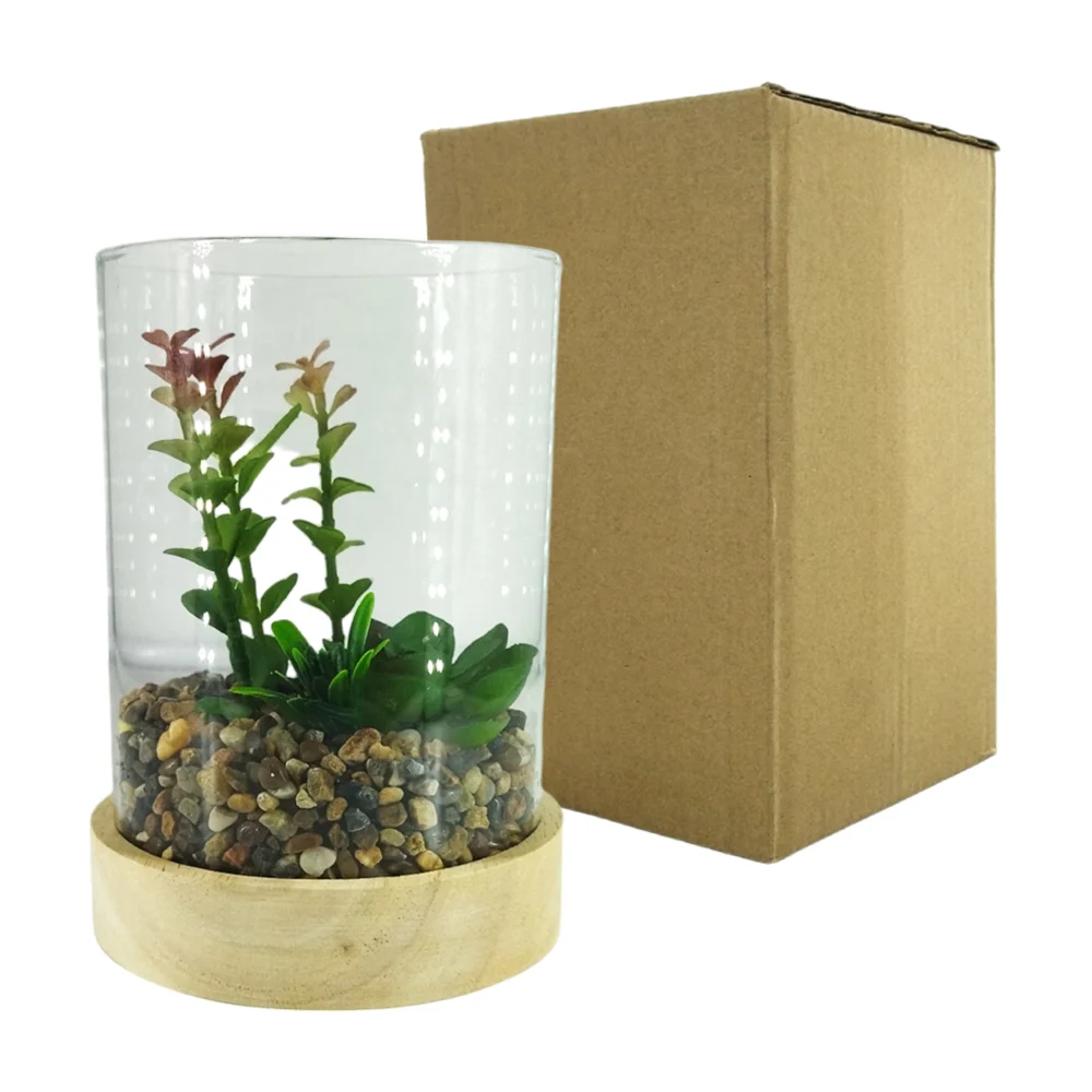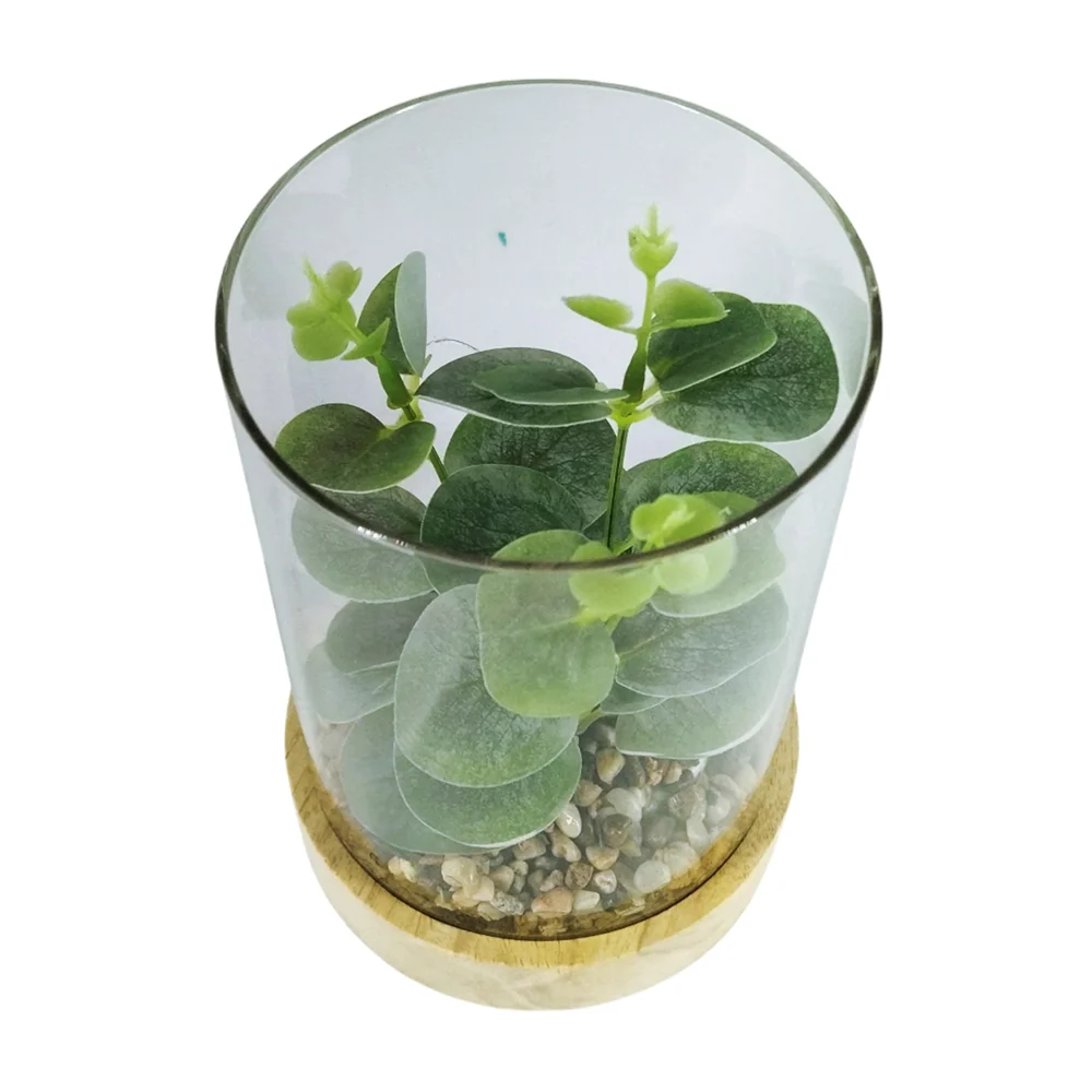Planta artificial en un recipiente cilíndrico transparente de vidrio con base de madera, variedad de modelos