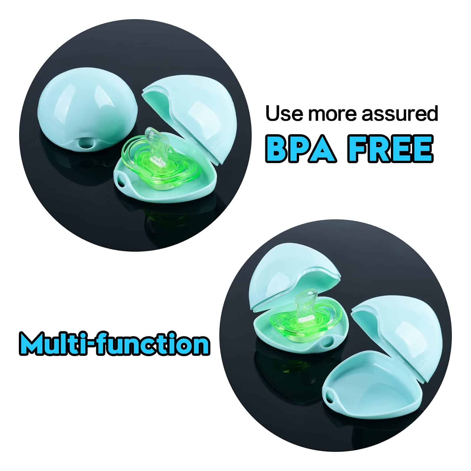1. Buena Calidad: Utilizando material PP saludable no tóxico, la caja para chupetes libre de BPA está diseñada para proteger el chupete y resulta muy útil para las madres.