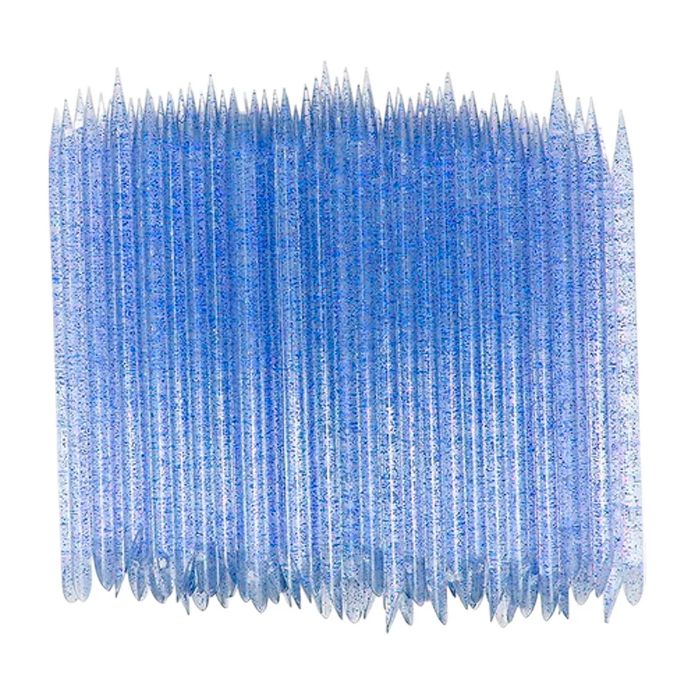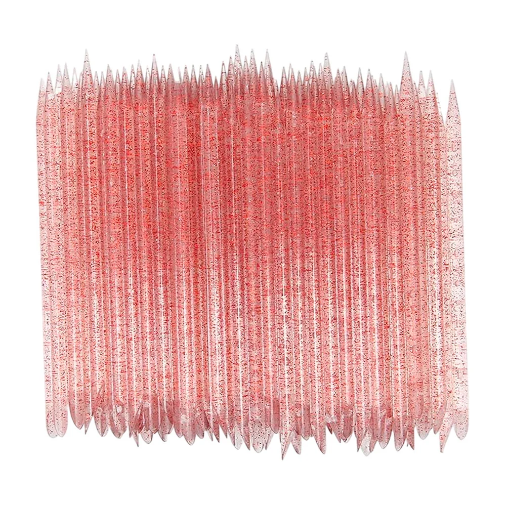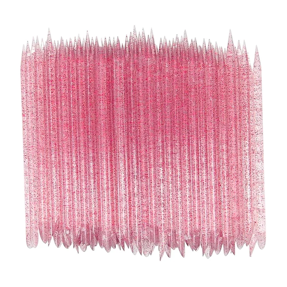 Empujadores de cutícula de plástico desechables con acabado de purpurina para uso en manicura y pedicura. Vienen en un paquete surtido de 100 unidades con variedad de colores (plata, azul, rosa y rojo).