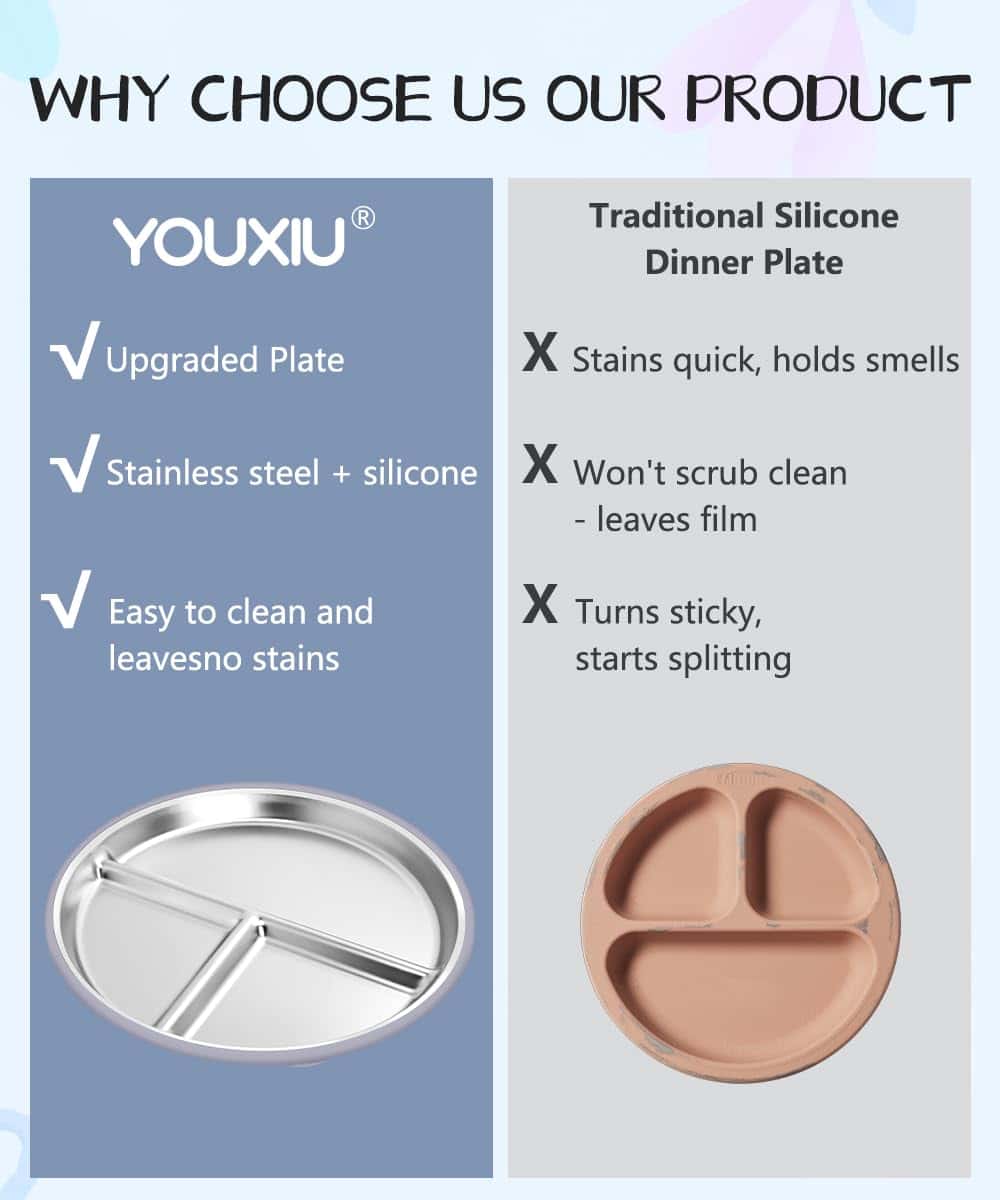 2. Material seguro y duradero: Los platos de acero inoxidable para niños con silicona están hechos de acero inoxidable con una superficie lisa, libre de BPA y no absorberán aceite ni residuos de alimentos. Son completamente diferentes de las ventosas tradicionales para bebés, resolviendo eficazmente el problema, y puedes disfrutar de comidas frescas y naturales cada vez, manteniéndolas frescas y seguras.