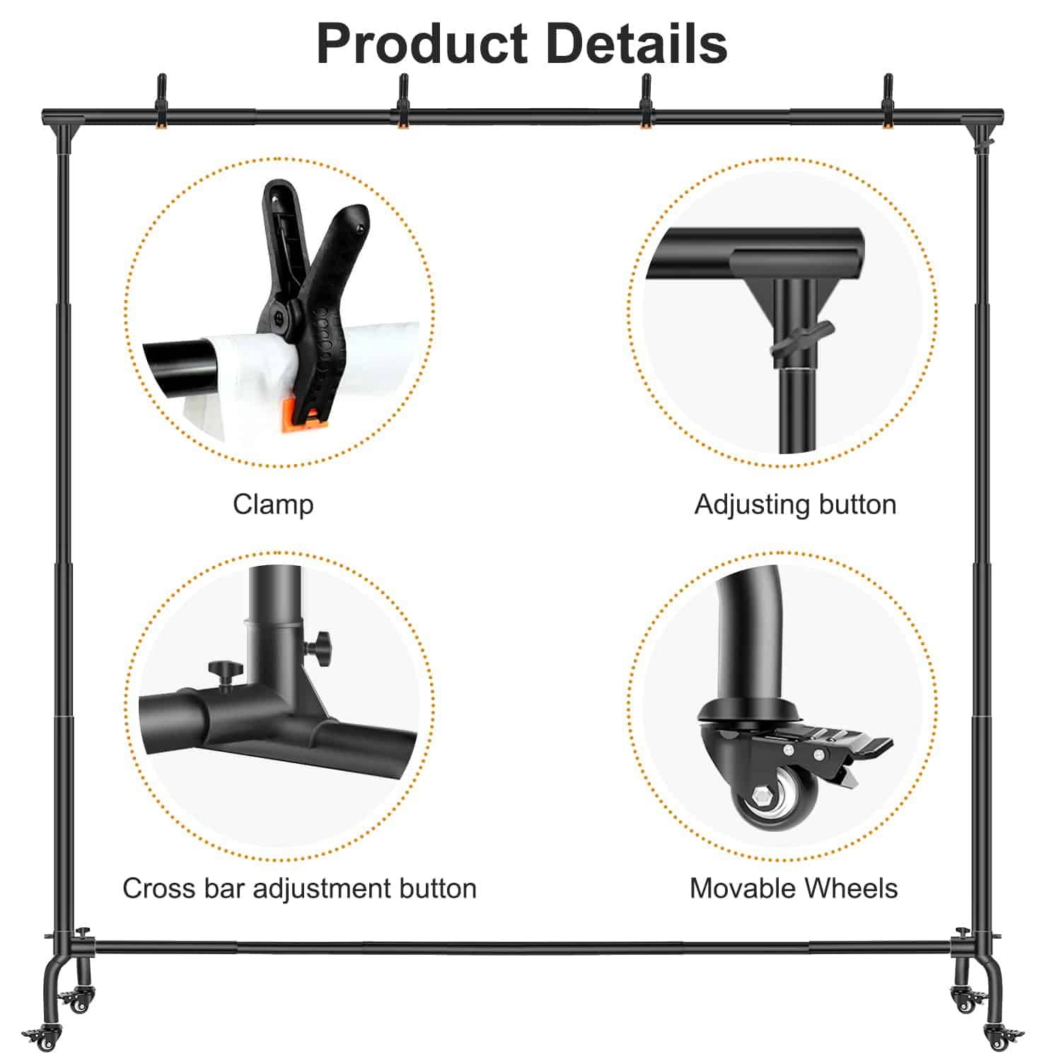 4. FÁCIL DE ENSAMBLAR – El soporte de fondo fotográfico es fácil de ensamblar, todas las conexiones se pueden unir o separar manualmente. No se requieren herramientas adicionales. Cada rueda tiene un freno para mantenerla en su lugar. Si necesita moverlo, simplemente active el freno y arrástrelo hacia adelante y hacia atrás, sin tener que esforzarse más para mover el fondo pesado.