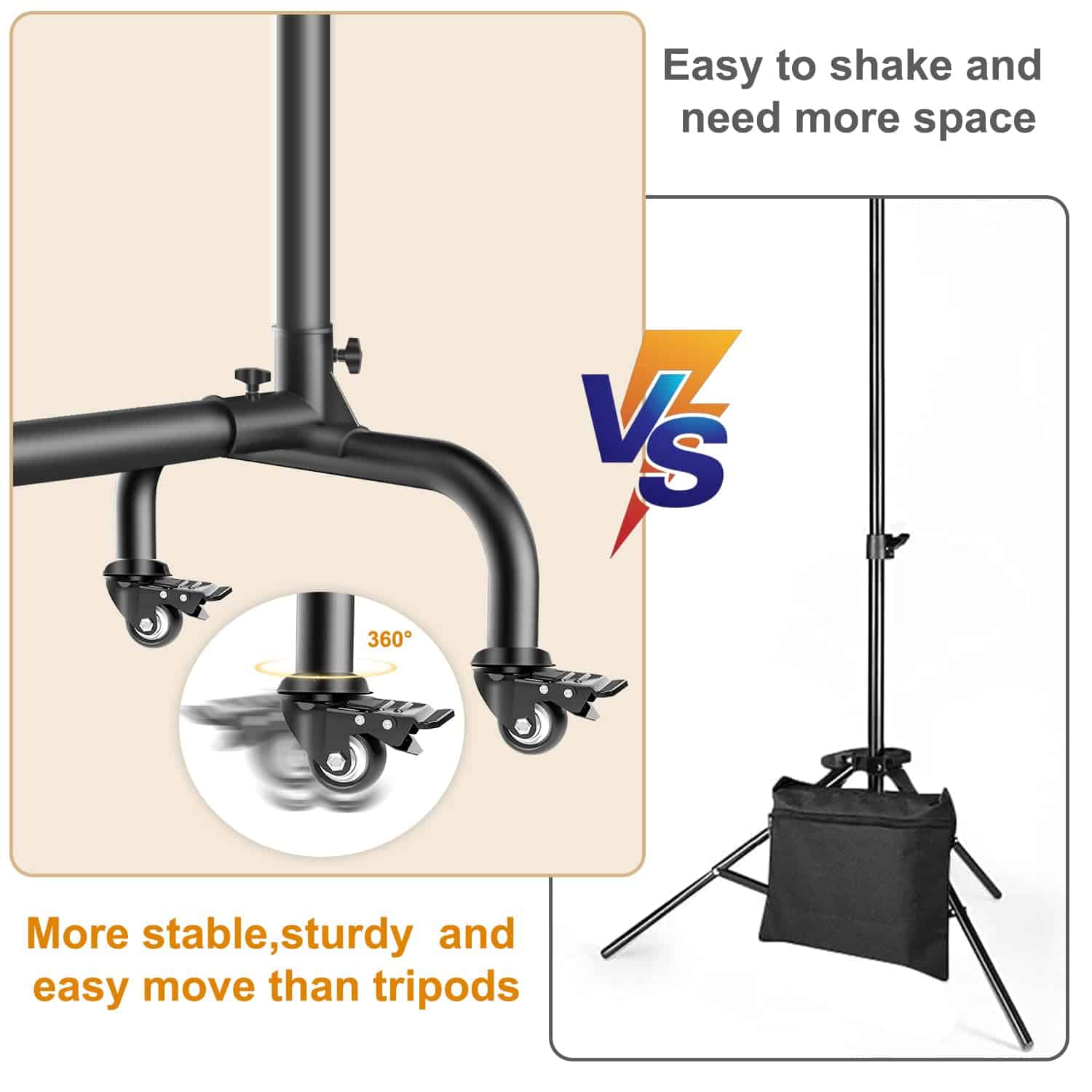 1. BASE DE RUEDAS MÁS ESTABLE – Nuestro soporte de fondo agrega una barra de nivelación en la parte inferior con una base de ruedas resistente. En comparación con el soporte de fondo normal, aumenta la estabilidad del soporte. Por lo tanto, puede transportar fondos pesados y evitar temblores. Las ruedas tienen ajuste universal y absorción de impactos para facilitar la movilidad.