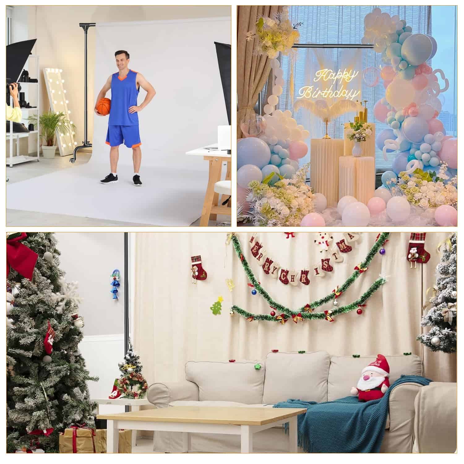 2. SOPORTE DE FONDO AJUSTABLE – Puede ajustar libremente el tamaño del soporte de fondo fotográfico según sus necesidades. Proporcionará una gran versatilidad y flexibilidad para sus necesidades decorativas o fotográficas. La altura está entre 3-7.5 pies y el ancho está entre 3.85-10 pies.